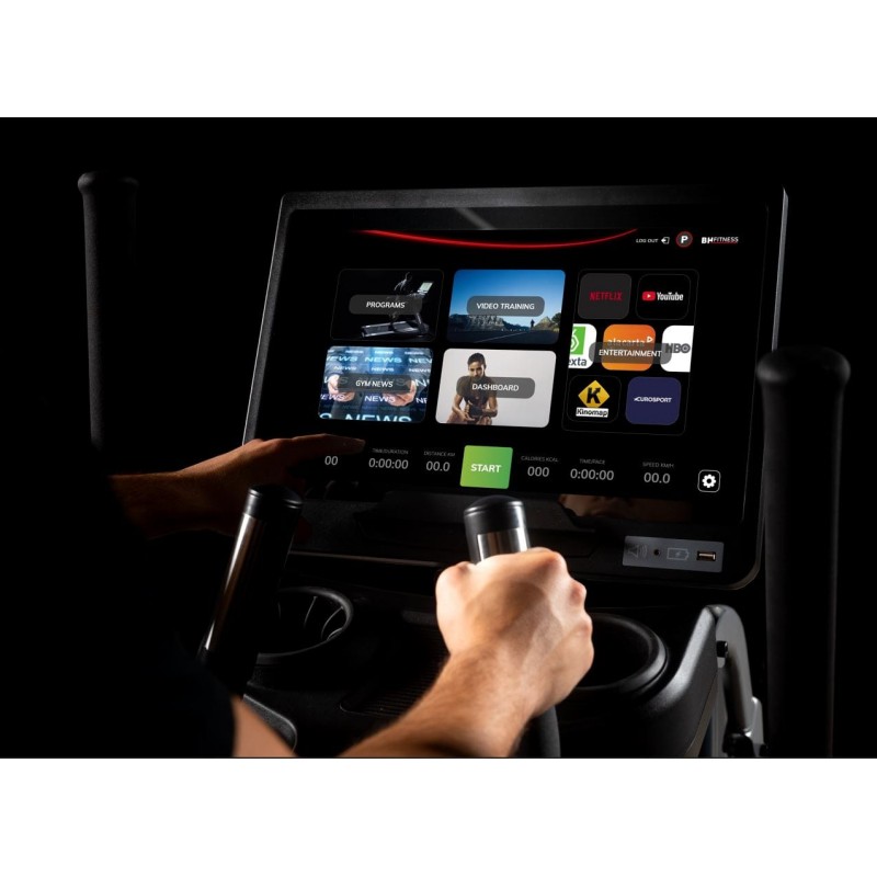 A BH Fitness Movemia EC1000-et kifejezetten professzionális környezetre tervezték, ahol napi szinten több száz felhasználó veszi igénybe az eszközöket. A 19”-os Smart Focus kijelző teljesen új szintre emeli az edzésélményt: valós idejű edzésadatokat jelenít meg, lehetővé teszi a virtuális pályákon történő edzést és multimédiás tartalmak elérését. Emellett a gép kialakítása rendkívül masszív és hosszú élettartamú, így az állandó, intenzív igénybevétel sem okoz problémát. A mozgás biomechanikája természetes, ami minimalizálja az ízületekre ható terhelést, és kényelmes edzést biztosít minden felhasználónak. Nagyon kicsi Q faktorral (pedálok közti távolsággal) rendelkezik, mindösszesen 6cm a távolság! Kissebb helyigényű mint egy átlagos elliptikus tréner!